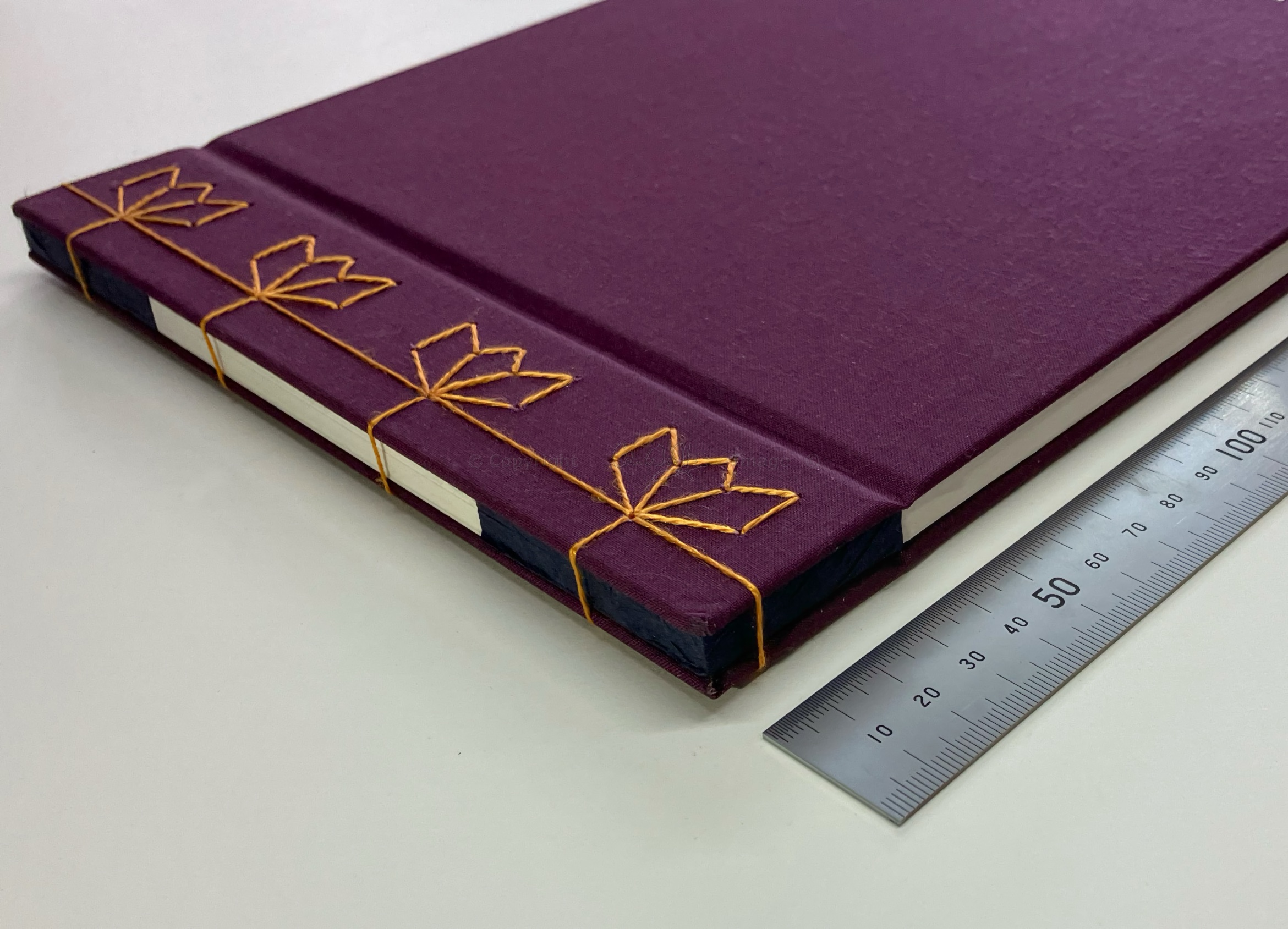 • Paper:   150-200 gsm approx. plain soft white cartridge paper. The paper block is sealed in the traditional way by wrapping and sticking down paper over the two spine corners, in this case handmade indigo Lokta paper.