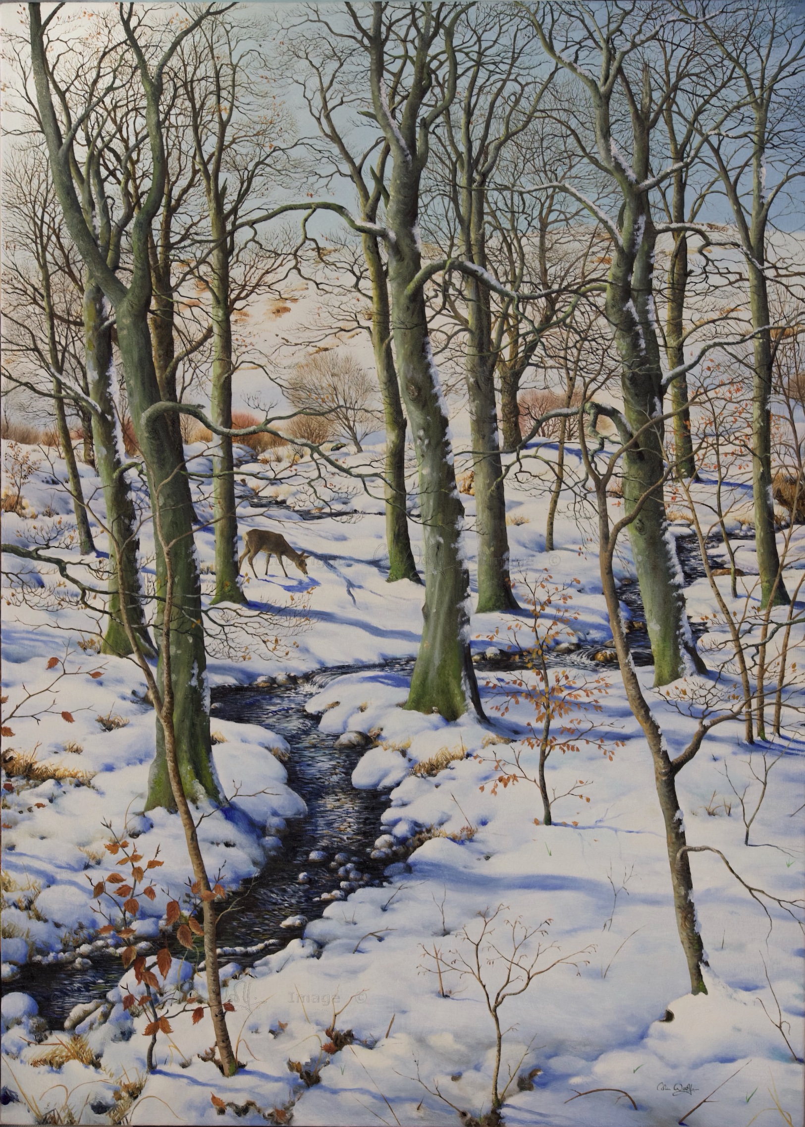 ‘Winter Woodland with roe’ – this painting has been in my head for some time, a memory of a special day in Glen Lyon after a heavy fall of fresh snow.  It has taken a long time to paint as there was no real firm layout, it was just an idea.